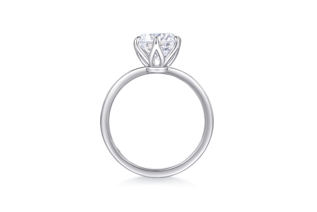 Med sin höga fattning framhävs centerdiamanten på ett elegant sätt, samtidigt som den smala profilen gör den delikat och vacker.