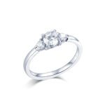 Alissa är en vacker trestensring med två mindre briljantslipade diamanter vid sidan av centerstenen. Sidodiamanterna har en treklorsfattning för att framhäva mer av diamanterna. Den mjuka skenan och den låga fattningen låter diamanterna stå i fokus.