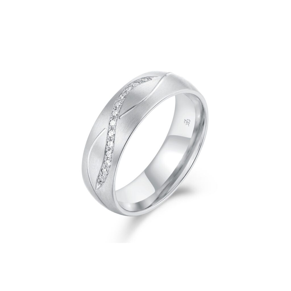 Denna ring är infattad med 13 diamanter totalt 0,065 carat och har en höjd på 1,8 millimeter samt en bredd på 6 millimeter.