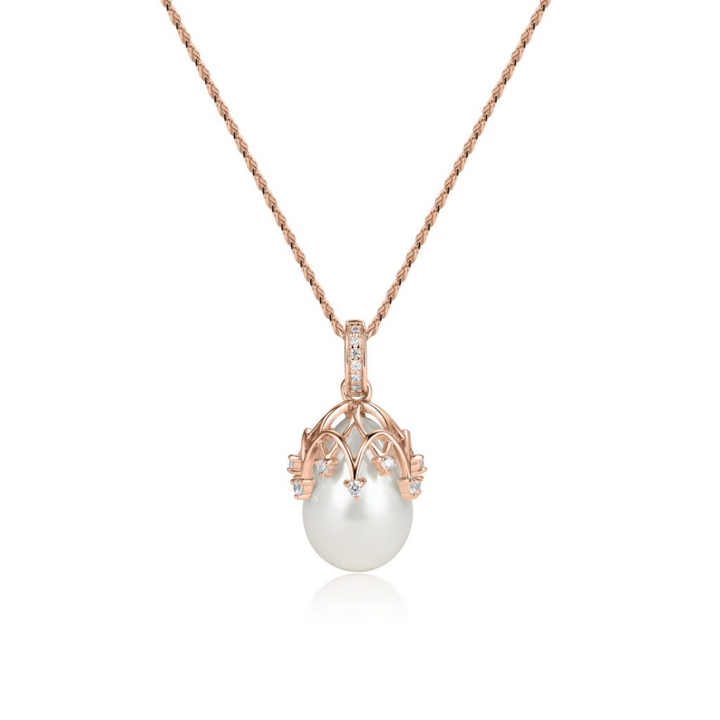 Aria är ett unikt och annorlunda pärlhalsband med vackra mjuka mönster detaljer av guld och diamanter som omfamnar pärlan.