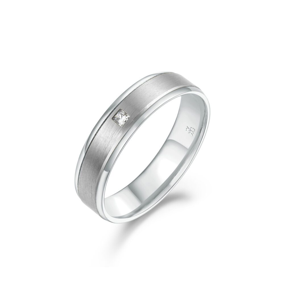 Denna ring är infattad med 1 diamant totalt 0,04 carat och har en höjd på 1,6 millimeter samt en bredd på 5,5 millimeter.