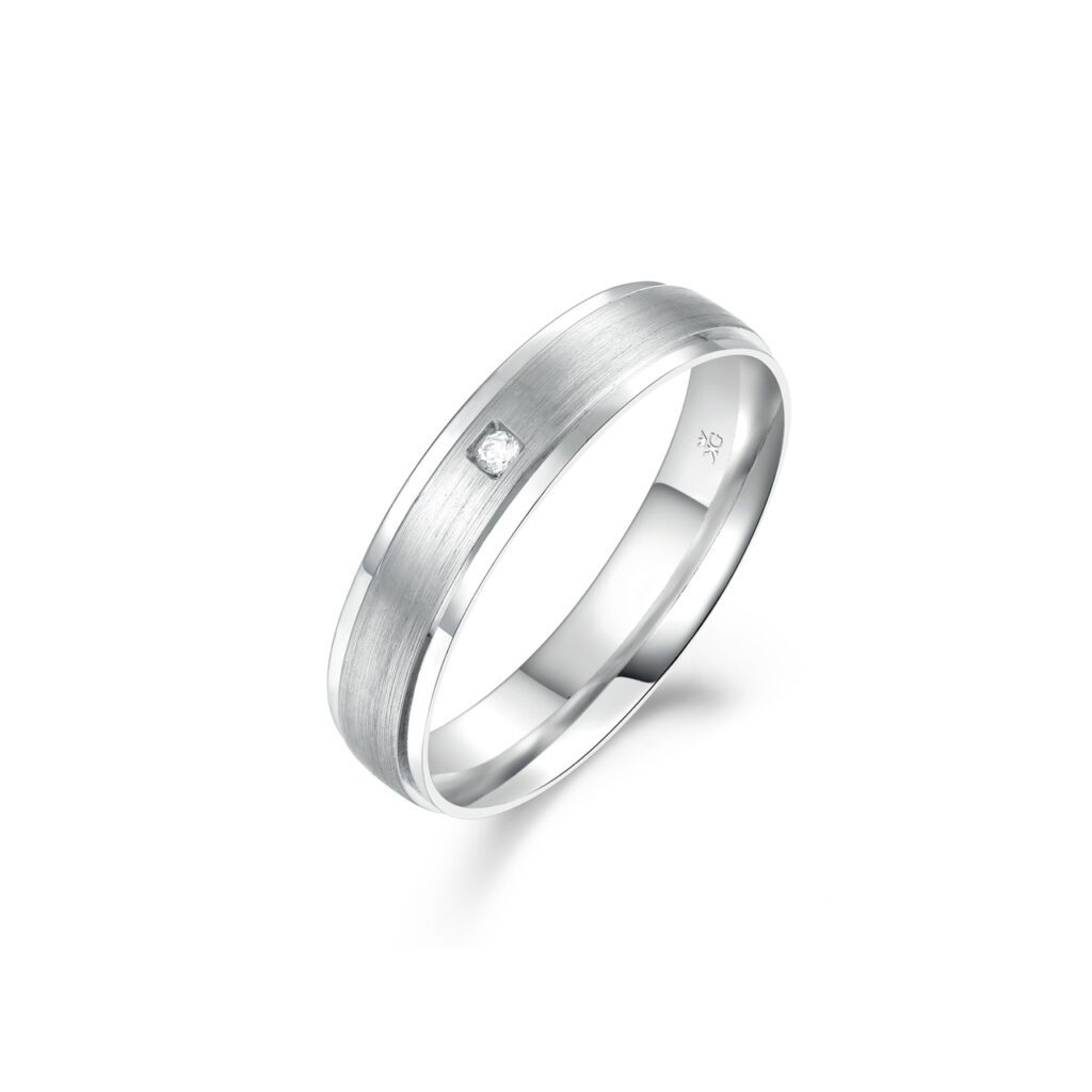 Denna ring är infattad med 1 diamant totalt 0,01 carat och har en höjd på 1,2 millimeter samt en bredd på 5 millimeter.