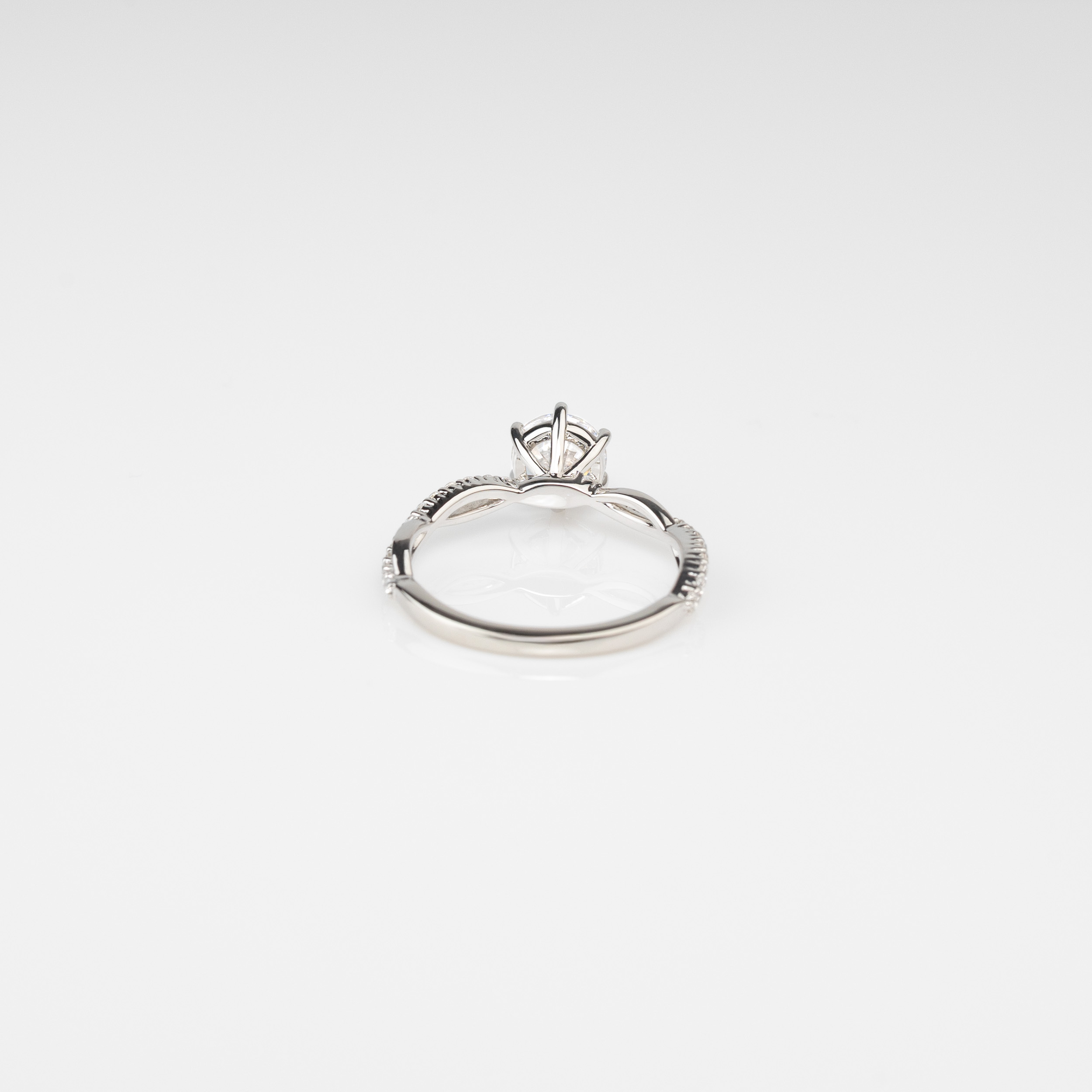 Eira är en unik ring med ett vridet band som påminner om en slingrande kvist. I centrum sitter en gnistrande diamant, ena sidan i slät metall, den andra dekorerad med 28 små diamanter. En ring som är både delikat och tidlöst elegant.
