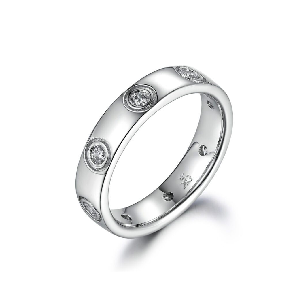 Giana är en lekfull ring med symmetriskt utspridda små boetter som håller i diamanterna. Giana sitter fint på i kombination med en förlovningsring men däremot så går det jättebra att bära Giana ensam de dagarna man inte har lust att bära båda sina ringar!