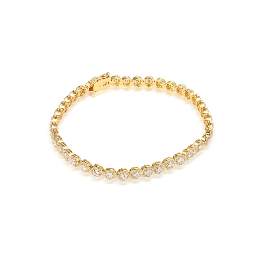 Våra halo armband går att anpassa utefter dina egna önskemål såsom storlek på diamanterna, längd och även i vilken metall du önskar. På halo armbandet är det storleken på varje mitten diamant som avgör bredden. Våra armband börjar från bredden cirka 1,3 millimeter (0,01 carat på varje diamant) upp till cirka 3 millimeter (0,10 carat på varje diamant). Diamantkvalitén är G/SI.