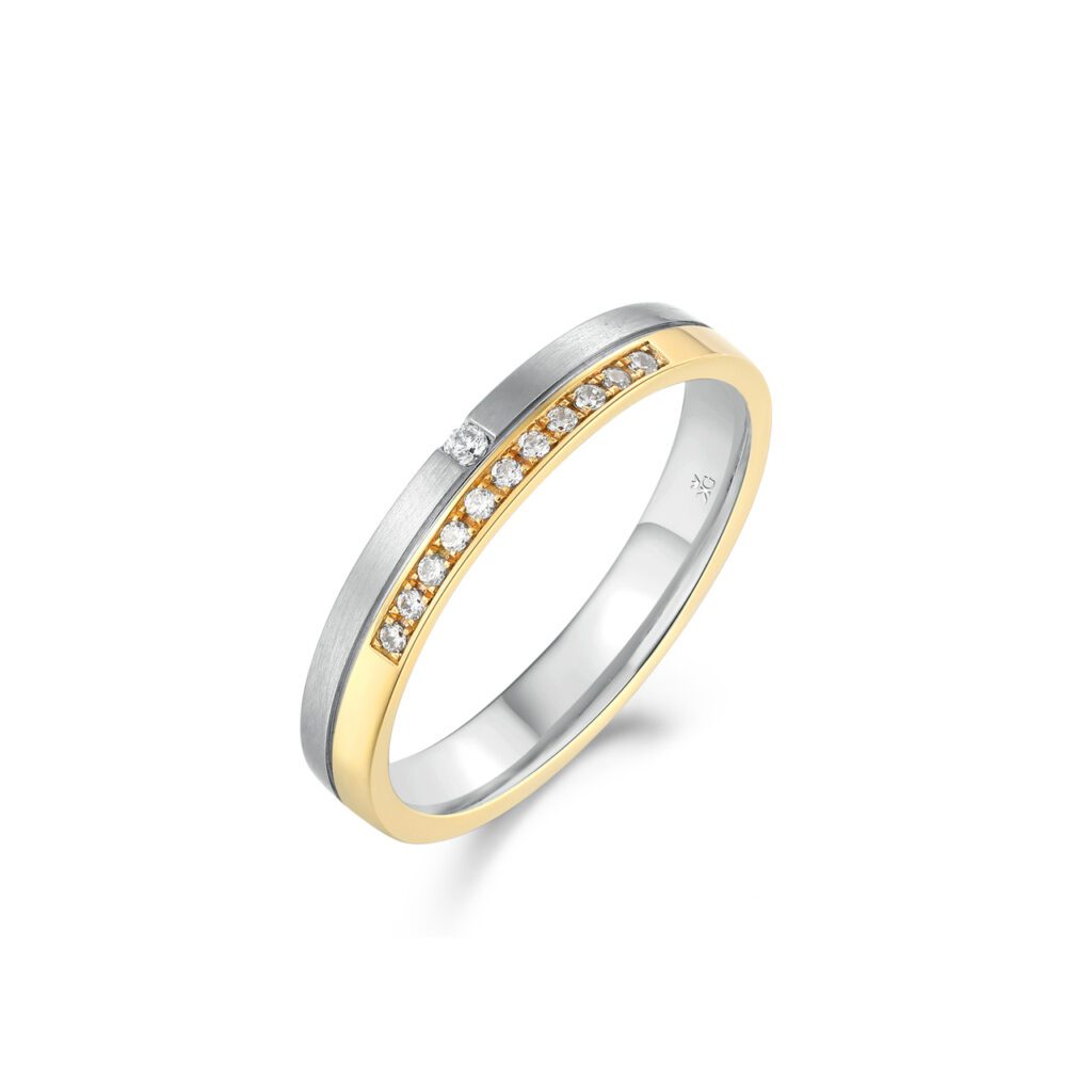 Denna ring är infattad med 12 diamanter totalt 0,07 carat och har en höjd på 1,6 millimeter samt en bredd på 3,5 millimeter.