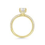 Melody är en ring som utstrålar exklusiv lyster. Den har en hel rund skena med diamanter på skenan och höjden, diamanter på klorna och en elegant dold halo. En design som sticker ut oavsett vilken diamantform du väljer.