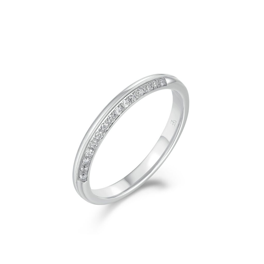 Denna ring är infattad med 15 diamanter totalt 0,075 carat och har en höjd på 1,6 millimeter samt en bredd på 2,5 millimeter.