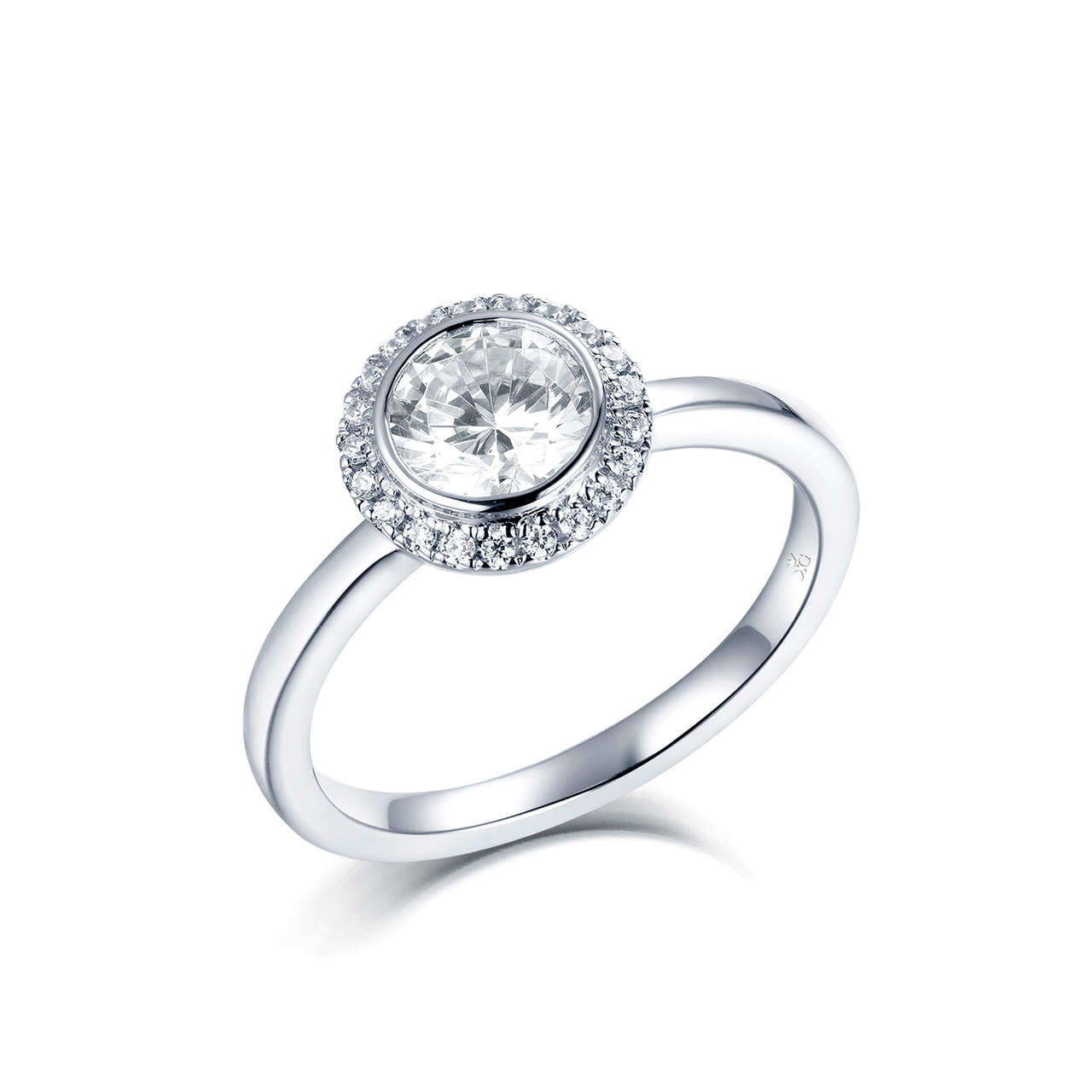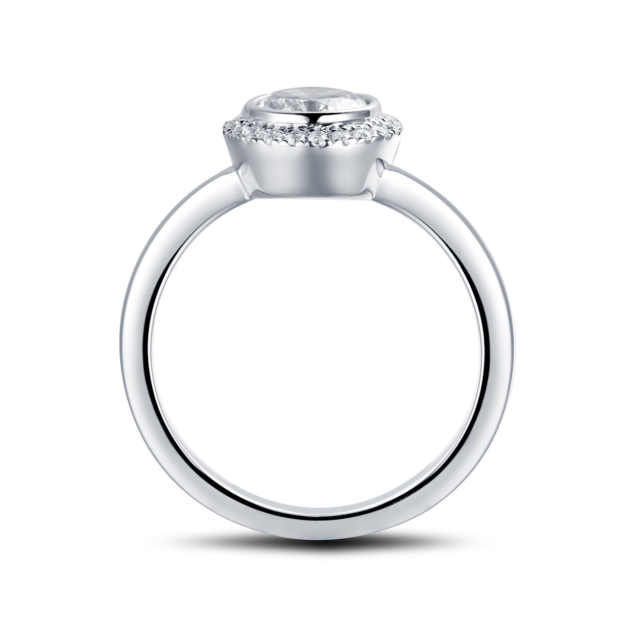Noura är en vacker haloring med en unik bezelinfattning som framhäver diamantens elegans och runda form, istället för den klassiska klofattningen.