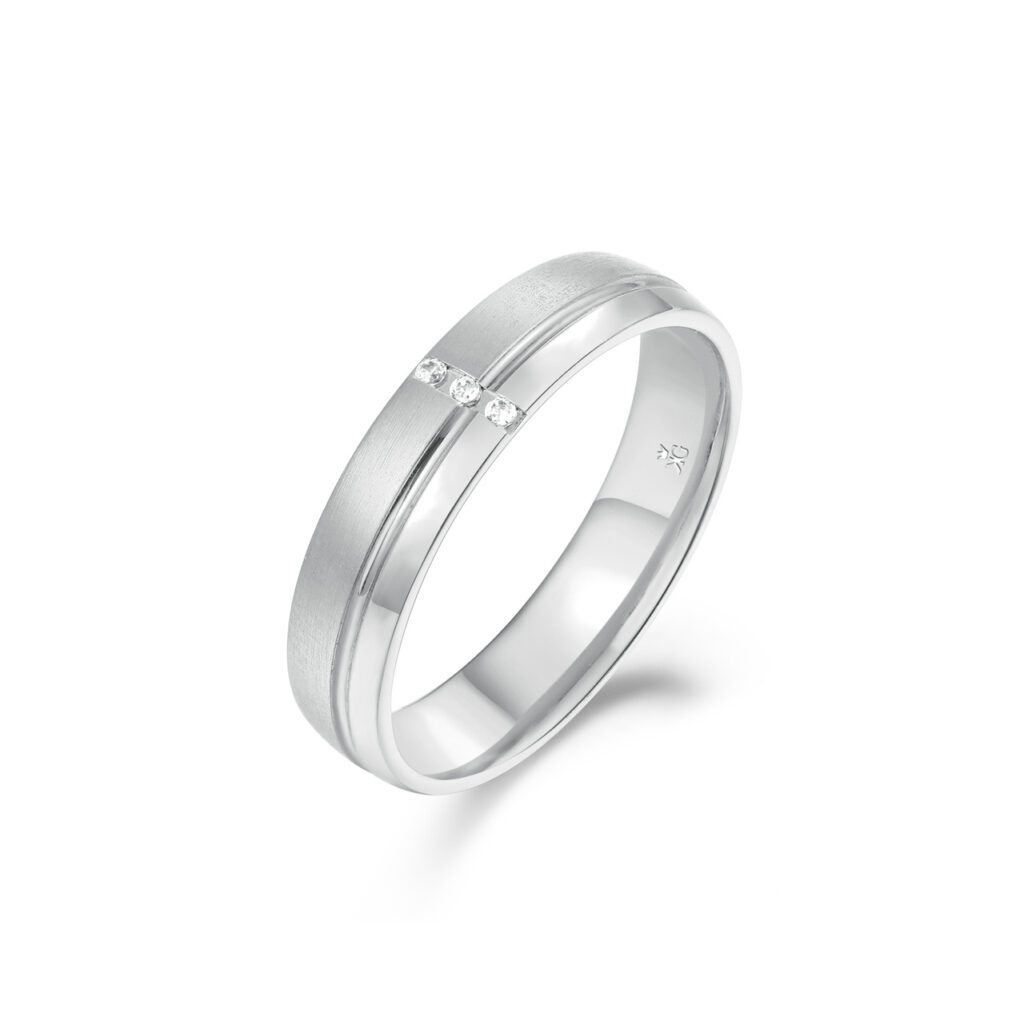 Soraya har en mattborstad och en blankpolerad yta som delas av ett diskret spår. Tre diamanter med ett litet mellanrum mellan sig ger extra lyster.