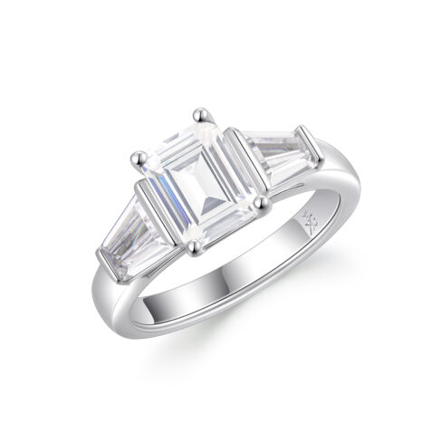 Tova är en elegant trestensring med breda, avsmalnande baguetter i barfattning. Centerstenen ramas in på ett vackert sätt mellan sidodiamanterna. Tova har en design som utstrålar både lyx och styrka och passar till alla diamantformer.