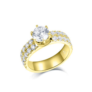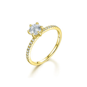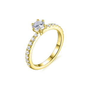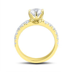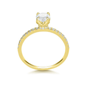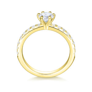En sidostensring i 18k gulguld är ett klassiskt och elegant val för dig som vill ha en ring med både värme och lyster. Diamanterna längs skenan framhäver huvudstenen och skapar en gnistrande helhet som aldrig går ur stil.